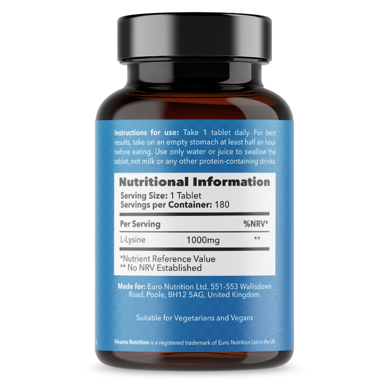 - L-Lysine 1000mg tablets – Vivanta Nutrition presents their powerful L-Lysine supplement providing 180 x 1000mg tablets in every bottle with added B12 and Biotin